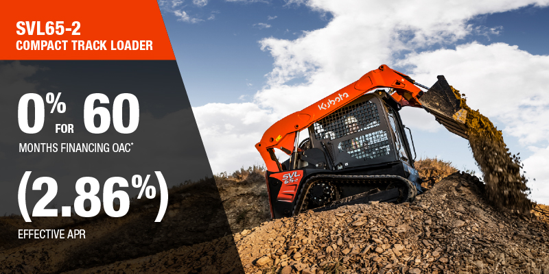 Representative finance example for the SVL65-2: $95,275.17 financed at 0% (2.86% effective APR which factors in $5,945.17 in non stackable cash that cannot be combined with finance offers) equals $1429.13 monthly for 60 months. $9,527.52 down payment required. Cost of borrowing is $5,945.17 for a total obligation of $95,275.17. Financing available on approved credit. Prices and payments include freight and other applicable fees (including environmental fees, administration fees, set-up fees, and dealer fees on the model specified). 0% for 60 months available only on SVL65-2 models Offer valid until 01-12-2026.
